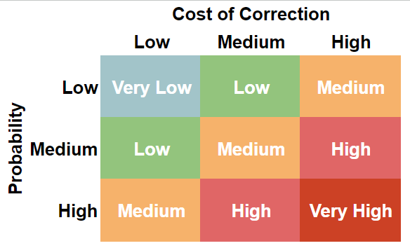 For our purposes, risk can be defined as the probability that a requirement, decision or course of action (guided or unguided) eventually turns out to be incorrect multiplied by the impact or cost of correcting the mistake when that time comes. I emphasize when not because it is inevitable but because over time the probability of a mistake tends to reduce ("so far so good") but the cost of correction tends to increase with your investment of time and effort. Below is a standard risk matrix showing calculated risk level for our two inputs.